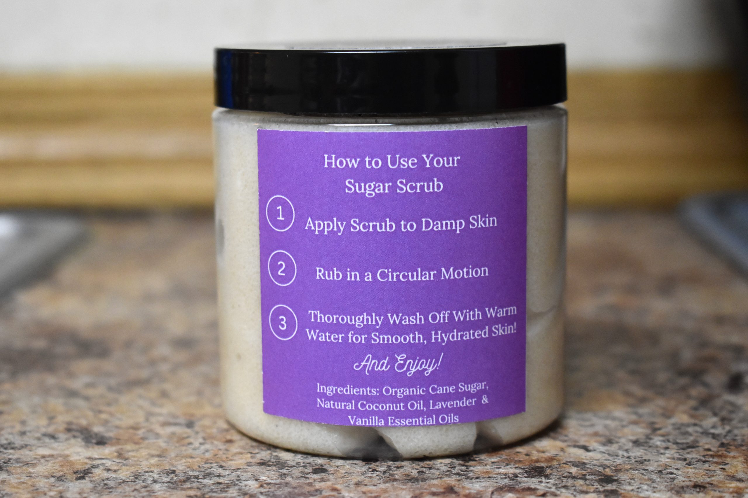 Organic Cane Sugar, Unrefined Coconut Oil, Pure Lavender Essential Oil, Vanilla Essential Oil, & Vitamin E Oil